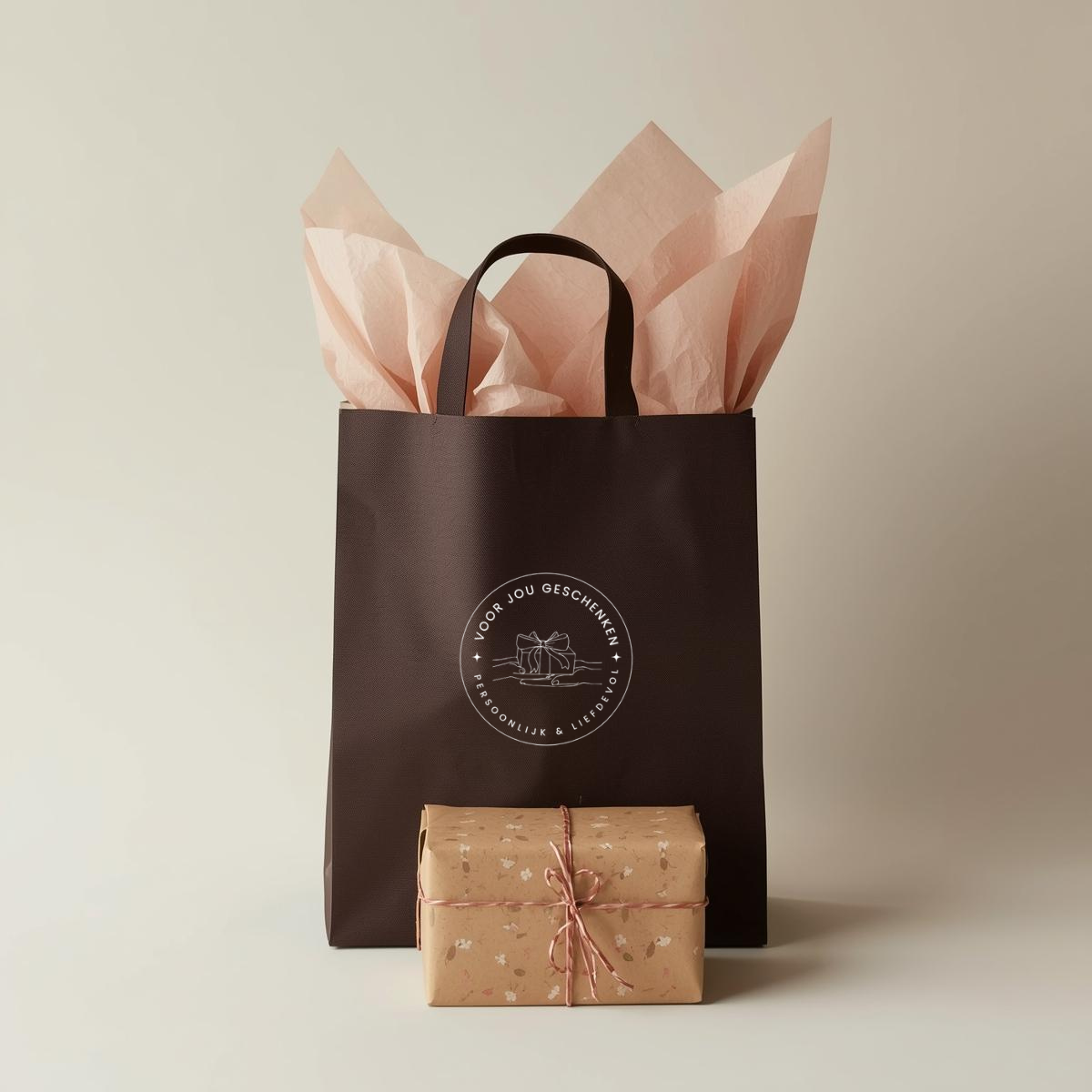 Deze exclusieve verpakking bevat cadeaupapier (met lint), zacht tissuepapier, een bijpassend kaartje, en een herbruikbare cadeautas met het logo van Voor Jou Geschenken.
